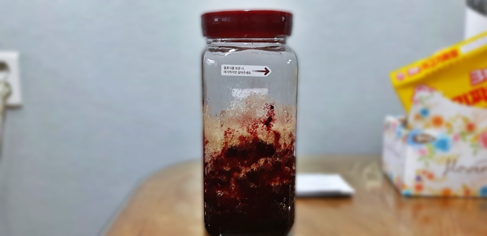 일단 복분자를 설탕에 절여 놓은 채 3일간 방치하면서 자연 발효할 시간을 두었다. 복분자와 설탕의 배합비는 1 : 0.2 ~ 0.3(복분자:설탕)비율을 추천하는데, 나는 거의 1 : 1 비율로을 투입했다. 설탕이 적으면 복분자의 진액 추출이 완전히 되지 않고 숙성도 제대로 되지 않을 수 있기 때문이다. 무엇보다 달콤해야 와이프도 먹을 수 있을 것 같아서다.