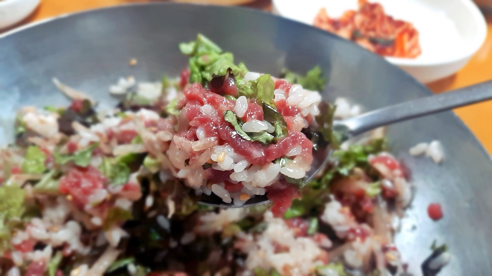 얼마전 다비치 강민경씨가 이곳의 '육회비빔밥'을 먹고 호평한 내용이 SNS에서 회자된 덕분이 것 같다.