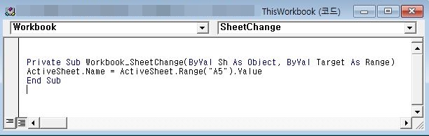 예를들면 홍길동의 자료가 담긴 시트가 있다면, A5셀에 '홍길동'입력하면 그 시트 이름이 '홍길동'으로 자동변환하게 된다.