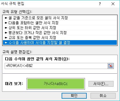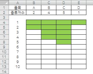 만약 품목A의 종류가 2개이면, 2개의 셀이 녹색으로 채워지고, 종류가 3개면 3개 셀이 녹색으로 채워지게 하는 것이다.