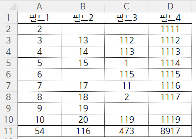 A2~D11 영역의 셀에는 문자 입력 불가토록 코딩함