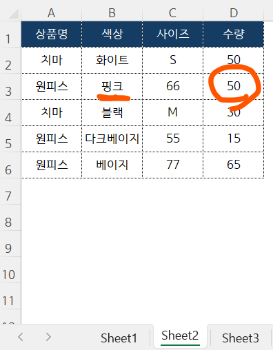 원피스 색상에는 '핑크'가 없으나 바로 전 값인 50을 불러 와 버림.