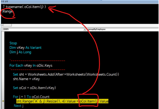 sht.Range("A" & j).Resize(1, 4).Value = oCol.Item(j).Value '그림2참조